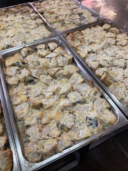 「かつおのガーリックマヨネーズ焼き」は、かつおに、にんにく、塩、こしょう、マヨネーズで下味をつけ、焼き物機で焼きます。マヨネーズを加えることで、パサつきをおさえています。