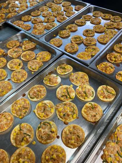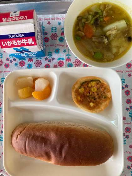 「変わりピザ」は、ツナ缶、コーン、ピーマン、ピザソース、チーズを混ぜ合わせて、ぎょうざの皮の上にのせ、焼き物機で焼く人気の献立です。