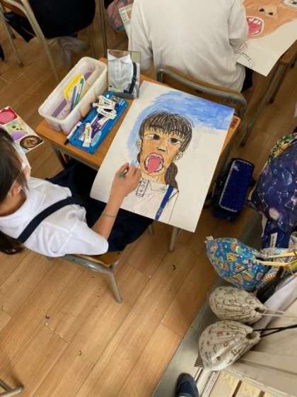 教室前の廊下を通ると迫力のある自画像を描いていたのでびっくりしました。
