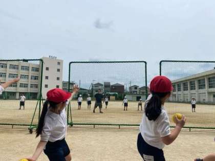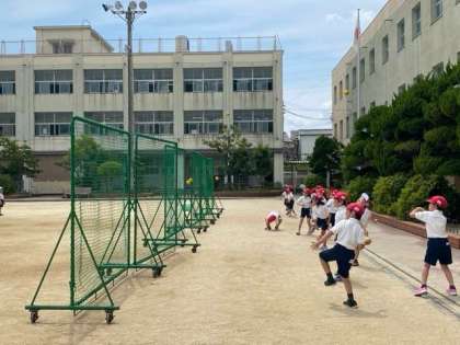 今月実施される体力調査に向けて、ソフトボール投げの練習を行っています。斜め上に向かって投げると遠くまで飛ばすことができますが真っすぐ投げてしまう児童が多いため、防球ネットを前に置いて練習を行っています。また、投げる手と反対の手で方向や高さを決めて勢いよく投げています。