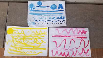 絵の具は水の量で、濃淡が決まります。まずは、水の量を調節する練習です。