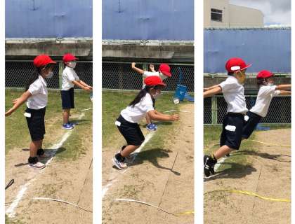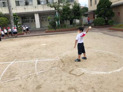 ソフトボール投げでは、遠くになげるためにしっかり前を見て、腕を大きく振って投げていました。