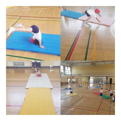 グループごとに分かれて、マット運動の連枝鵜をしています。
