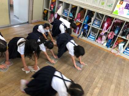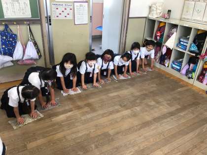 雑巾掛けでは、横のお友達とぶつからないようにしながら、まっすぐに端から端まで拭いています。