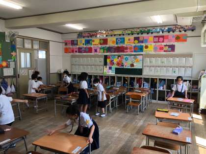 まず、すべての机を前に運び、箒で丁寧に後ろから前に掃いていきます。