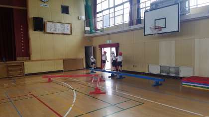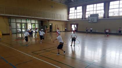 今日の講堂体育は、いろいろなものを出して、サーキットあそびをしました。