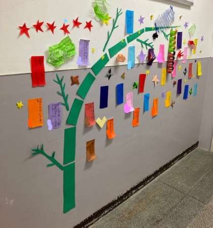 給食委員会で作った、「七夕の飾り」を飾っています。みんなの願い事がいろいろあって楽しいです。今年の七夕は晴れるでしょうか?