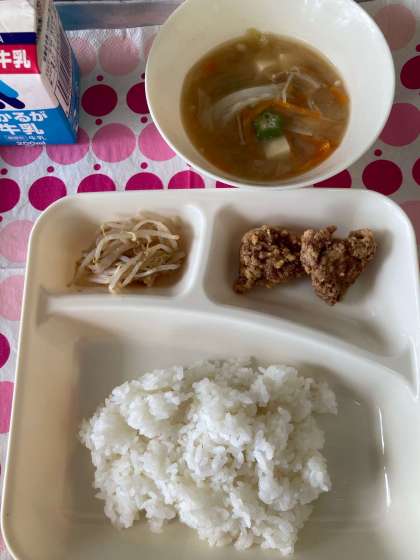 「豚肉の香味あげ」は、豚肉にしょうが汁、料理酒、濃い口しょうゆで下味をつけ、でんぷんをまぶし、カラッと揚げています。児童に大人気の献立です。