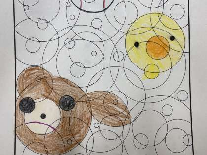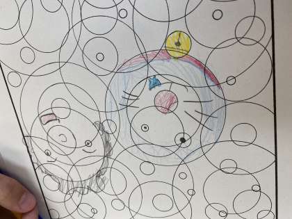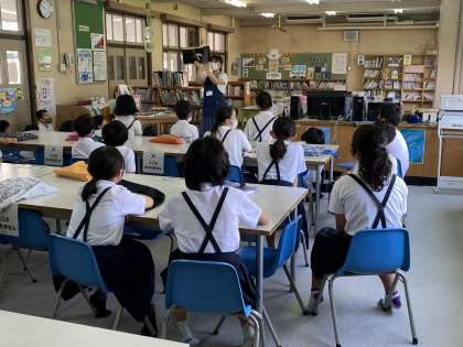 1学期、市川先生によるブックトークがありました。題名を隠した本の読み聞かせをしてもらい題名を考えたり、丸がたくさんある模様から発想力・想像力をはたらさせたりしました。最初はなかなか色を塗りだせずにいましたが、少し色を塗ると新しい絵が見えてきたようで、楽しく活動できました。
