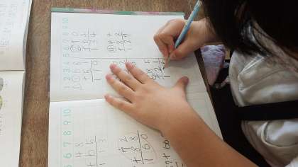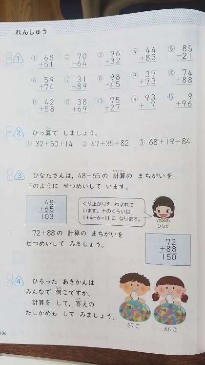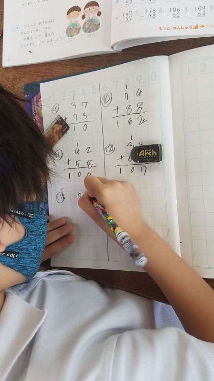 三つの数のたし算では、ゆっくりと丁寧に計算していきます。