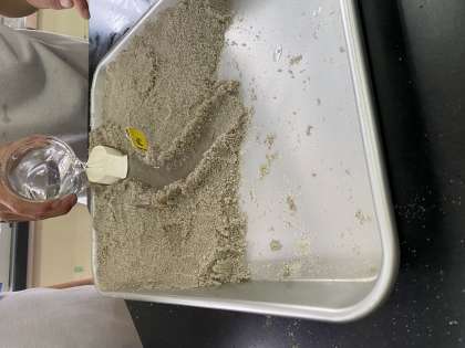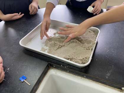 理科室にて、土で山を作り水を流す実験をしました。少ない水と多い水を流すときにはどんな違いがあるのか学習しました。教科書や動画を見て学習することも大切ですが、実際に実験することで理解が深まったようです。