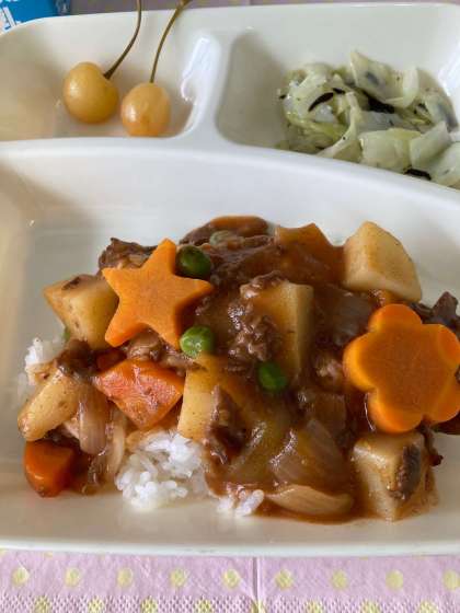 今日のハヤシライスは、小麦アレルギーの児童も食べることができるように、上新粉を使っています。牛肉、じゃがいも、玉ねぎ、にんじんを使い、水どき上新粉でとろみをつけ、調味料で味付けして煮込みます。今日はラッキー人参の日でした。