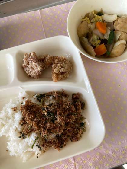「鶏肉のたつたあげ」は、毎回児童に好評の献立です。しょうが汁、料理酒、濃い口しょうゆで下味をつけることで、風味、色合いよく仕上げます。