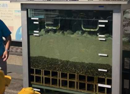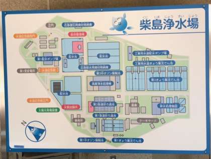 各工程を職員の方々が丁寧に説明していただき、その後室内で浄水の実験をしました。四万十川から購入している砂や粒状活性炭を使いました。汚れた水が透明になり、においも消えたことを目にすること驚きの声が上がっていました。