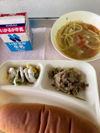 今日は食育の日でした。牛肉のカレー風味焼きもきゅうりとコーンのサラダも食べやすく、ほとんどのクラスが完食でした。