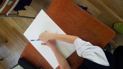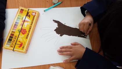 図工の学習で、秋の木を作ります。まずは自分の腕を使って、幹を作ります。