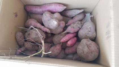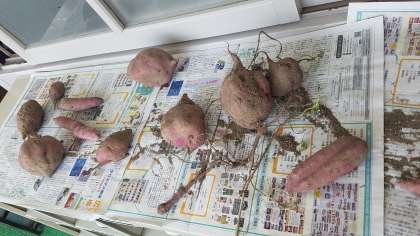 収穫したサツマイモは、ついた土が乾くまで乾燥しています。