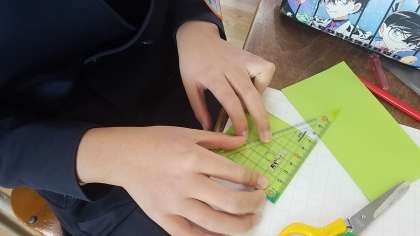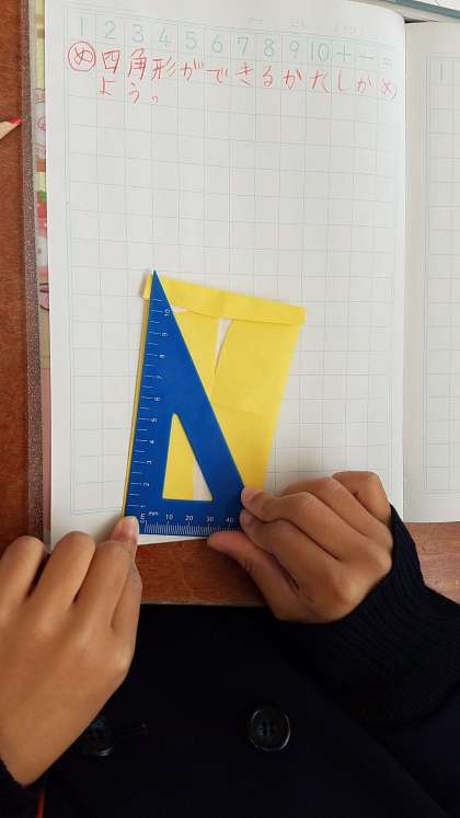 四つの角がどのようになっているのかを、三角定規を使って確認しています。