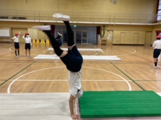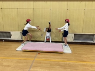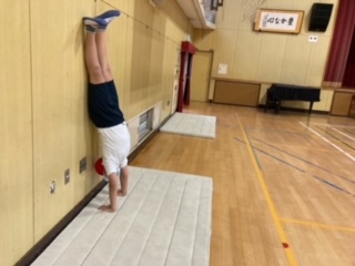 マット運動で倒立の練習をしています。友だちに支えてもらったり、ポイントを教えてもらったりして一生懸命練習を繰り返しています。できるようになった児童が増えてきました。倒立前転に挑戦している児童もいます。