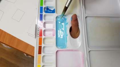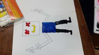 四角形や三角形で使ってかいた絵に、混色した絵の具で色を付けていきます。