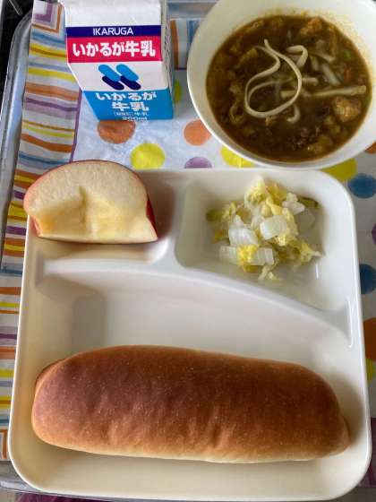 「カレーうどん」は、牛肉、うすあげ、玉ねぎ、にんじん、青みに青ねぎを使用します。毎年、大人気の献立です。