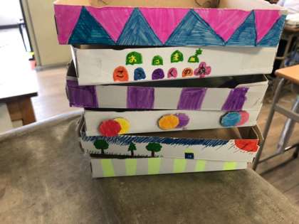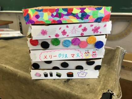 4階層のトレーに丸い穴を開け、下に落としていくゲームです。それぞれのトレーや柱にデザインをしています。コンパスを使って幾何学模様を描いたり、キャラクターを描くいたりと児童それぞれの思いが作品に表れています。