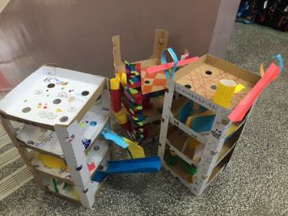 図工科では、ビー玉が転がる仕組みを使って、楽しく遊べる「コロコロガーレ」を制作しています。