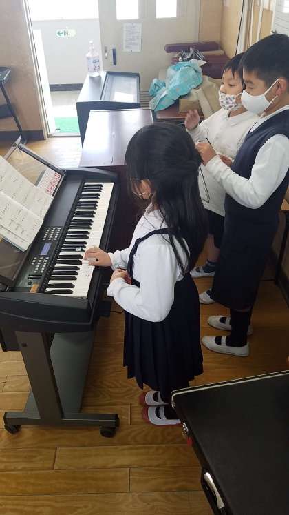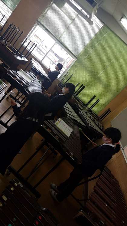 音楽室を使って、木琴や鉄琴、オルガンや打楽器の自主練をしています。