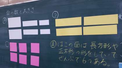 いろいろな形のはこを使って、どんな形がいくつかくれているのか調べました。