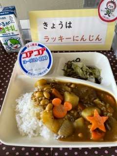 ドライパックの大豆を加えた「牛肉と大豆のカレーライス」です。ドライパックの大豆は蒸してあるので、水に溶け出しやすい栄養成分の流失を最小限に抑え、大豆本来の甘みや旨みも味わうことができます。ラッキーにんじんの献立です。