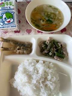 「いわしてんぷら」は油で揚げ、砂糖、みりん、米酢、こいくちしょうゆで作ったタレをかけます。「五目汁」はとうふ、キャベツ、たまねぎ、にんじん、青ねぎを使用しています。「豚肉とさんどまめのいためもの」は豚肉とさんどまめをいため、塩、こいくちしょうゆで味付けします。