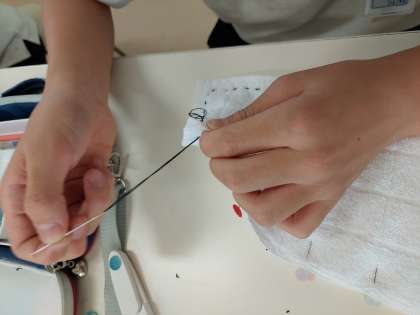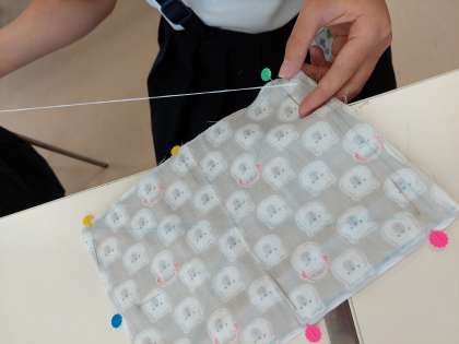 まち針で布を合わせて、チャコペンで印をつけて、なみぬいです。