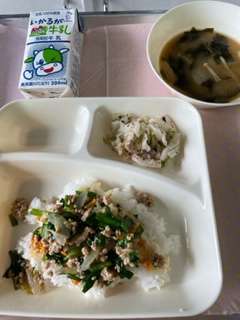「豚ひき肉とにらのそぼろ丼」は豚ひき肉、にんじん、たまねぎ、青みににらを使っています。ご飯がすすむ、児童生徒に好評な献立です。