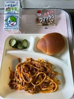 「スパゲッティミートソース」は、牛ひき肉、豚ひき肉を使い、小麦粉と綿実油をよくいためて作るブラウンルウで仕上げます。毎回、児童生徒に好評な献立です。
