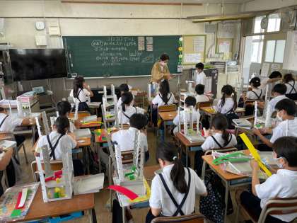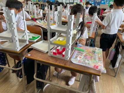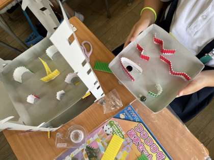 4年生の図工では今、”コロコロガーレ”というビー玉迷路に取り組んでいます。上段のスタートから下段のゴールまで、思い思いの迷路を完成させていきます。