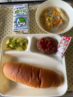 「豆乳スープ」はじゃがいも、たまねぎ、コーン、にんじん、青みにパセリを使用し、仕上げに豆乳を使用したスープです。今回は肉類を含まない野菜ブイヨンを使用しています。