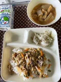 赤じそはさわやかな香りがあり、こい赤紫色をしています。おもに梅干しの色づけや、しそジュースなどに使われます。給食では赤じそを乾燥させて味つけしたものを使っています。
