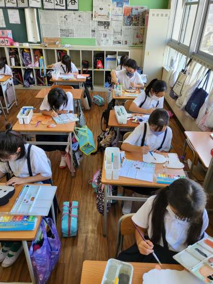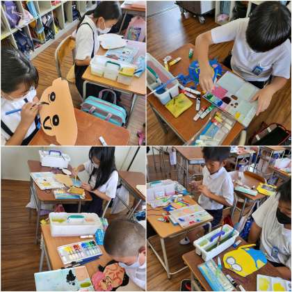 先週切ったホワイトボードになる板に、絵の具で色付けをしていきました。