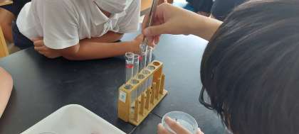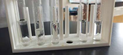 鉄やアルミニウムが入った試験管に、うすい塩酸を入れてみます。