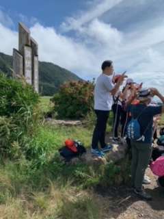 鉢伏高原のモニュメント前で、学級写真を撮り、いよいよ登山スタートです。前を向いてがんばろう!