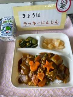 「チキンカレーライス[米粉])は、鶏肉を主材にした毎回好評な献立です。小麦アレルギーの児童生徒に配慮して米粉のカレールーの素を使用しています。ラッキーにんじんの献立です。