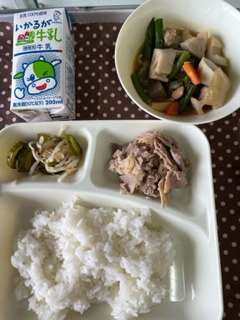「ふきよせ煮」は、豚肉、旬のさといもを主材に、れんこん、しめじなどを使用した煮ものです。「ふきよせ」とは数種類の煮ものなどを彩りよく盛り合わせた料理につけられる日本料理の名前です。