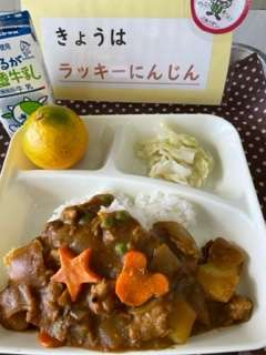 「ポークカレーライス(米粉)」は小麦アレルギーのある児童生徒も食べられるように米粉のカレールゥの素を使用しています。豚肉を主材に、じゃがいも、たまねぎ、にんじん、青みにグリーンピースを使用しています。今日はラッキーにんじんの献立です。