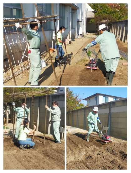 学校お留守番チームで畑の整備作業をしました。連作障害にならないように、学年の畑の場所を変えて、これから植える苗に合わせた肥料をブレンドし、土を耕します。