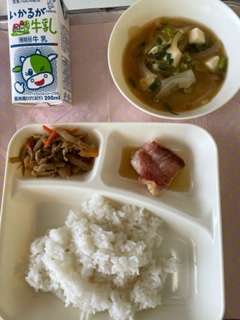 「なめこのみそ汁」はとうふ、たまねぎ、はくさい、なめこ、青ねぎを使用しています。なめこは、ブナの切り株などに発生するぬめりのあるきのこの一つです。給食ではみそ汁の実として使用しています。