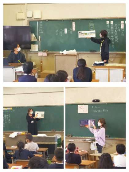 地域の絵本クラブ「チューリップ」のみなさんによる朝の読み聞かせの様子です。順番に1年から6年生まで全部の教室で読み聞かせをしてくださっています。