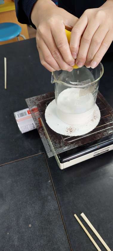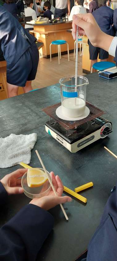 温めた牛乳にあるものを加えると、牛乳が固まっていきます。