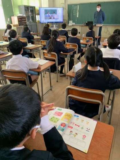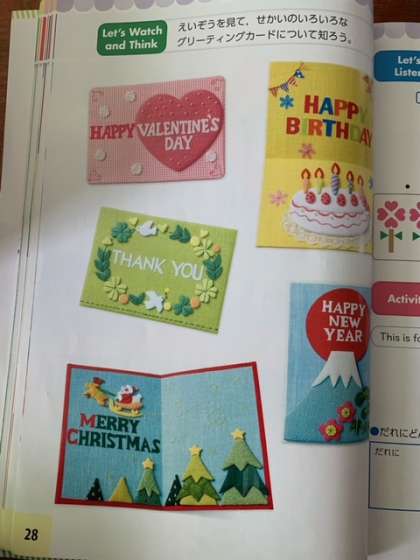 授業の中で、グリーティングカードについて、英語で教えてもらっていました。時々、担任の先生が、フォローして説明してくださってましたが、何となく理解できている様子の子もいました。CーNETの英語を聞いて、どんどん活用しながら力をつけていってほしいです。