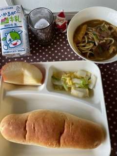 「カレーうどん」は、牛肉を主材に、うすあげ、たまねぎ、にんじん、青みに青ねぎを使用します。牛肉、野菜をいためて、だしを加えて煮、塩、カレールゥの素、こいくちしょうゆで味つけします。寒い時期に体の温まる一品です。