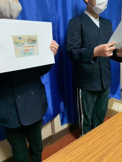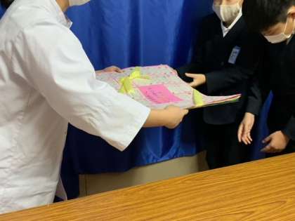 いつも美味しい給食を作ってくださっている給食調理員さんへ、全校児童一人ひとりから、お礼のメッセージの贈り物の贈呈もありました。